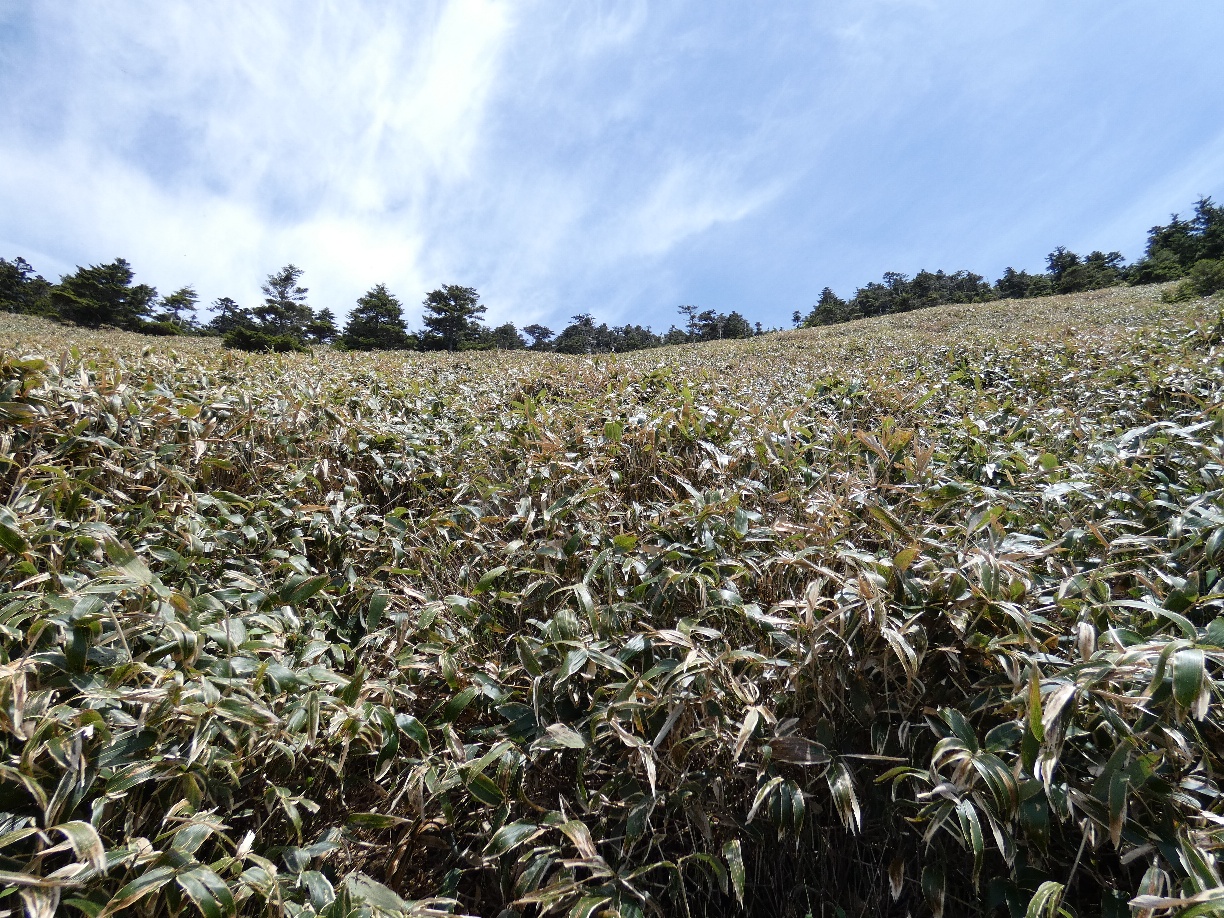 11時9分 爽快な笹原のトレッキングといいたいところですが風が弱まると暑いし虫が多くて大変です。